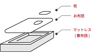 1.本体カバー | 2.固綿 | 3.ヌード布団 | 4.2way 布団カバー | 5.敷きパッド | 6.サイドパッド | 7.傾斜クッション | 8.リングまくら