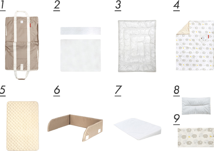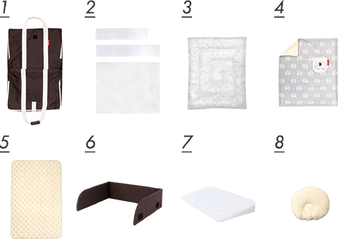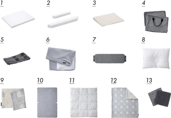 1.マットレス中芯×2枚 | 2.フレーム中材×6個 | 3.スロープクッション中芯 | 4.マットレスカバー | 5.フレームカバー×4枚 | 6.綿パイル スロープクッションカバー | 7.サイドパッド×4枚 | 8.ベビーまくら中芯 | 9.3重ガーゼ ベビーまくらカバー | 10. 綿パイル敷きパッド( 60×90cm ) | 11.ダウンライク掛けふとん( ベビーサイズ )| 12.3重ガーゼ2way掛けふとんカバー | 13.面テープカバー