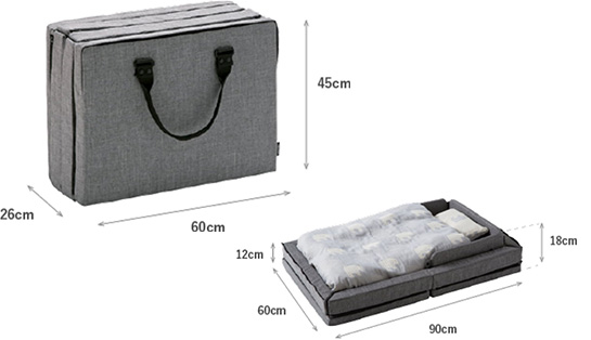 コンパクトベッドは、サッと折り畳むだけでひとまとめになり、バッグ型になるので