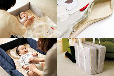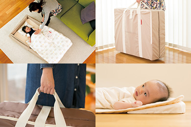 お布団派のファミリーに紹介したいのが、持ち運びも便利な「コンパクトベッド」シリーズ。ガード(枠)がついているので、添い寝も安心・安全に行っていただけます。