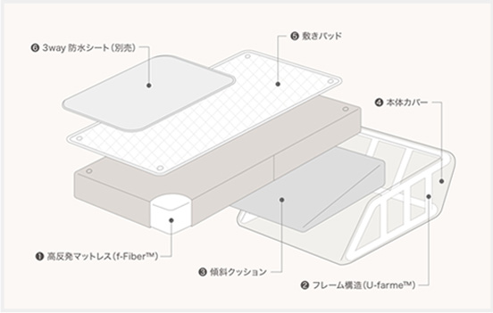 ❸ 独自開発したフレーム構造(U-Frame™)は、軽量かつ外側からの荷重にも耐える強度を実現しました。パパママの寝返りやお布団から低月齢の赤ちゃんをしっかり守ります。