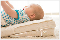 ❷ 傾斜9度のクッションが赤ちゃんに負担のかからない寝姿勢をサポートします。授乳後の吐き戻しや鼻づまりを和らげる効果があります。
