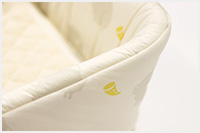 ❺ 赤ちゃんの手や頭部がフレームに当たっても痛くないように、本体カバーには中綿がたっぷり入っています。パパママも安心してお使いいただけます。
