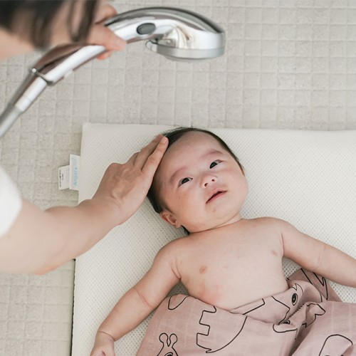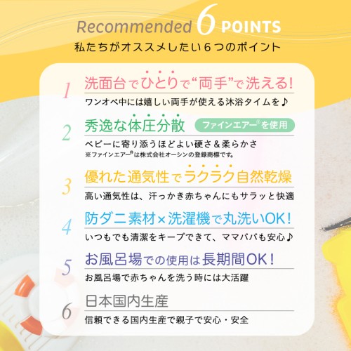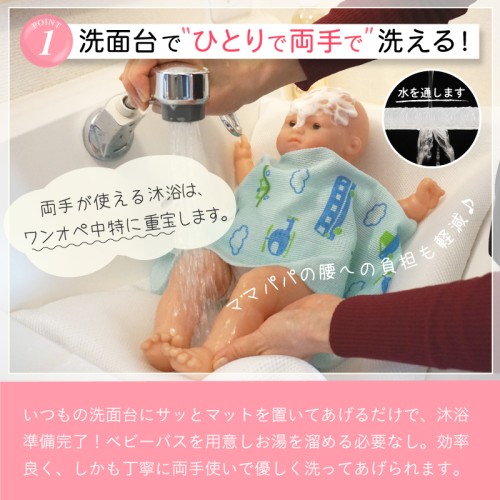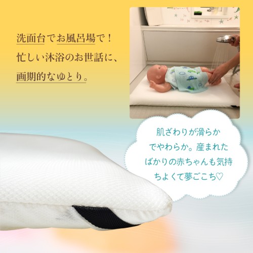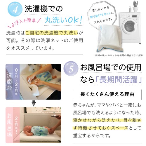 [体圧分散マットレス] 洗面台サイズのお風呂マットレスは、両手で赤ちゃんを洗ってあげられるので、ワンオペママでも安心です。お風呂場では寝かせながら洗ってあげられます。 体圧分散マットレスは通気性も良く、乾燥がスムーズなのでお手入れがしやすくて安心です。万が一、汚れが気になったら洗濯機で丸洗いできます!