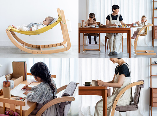 スクロールチェアは赤ちゃんから大人まで家族みんなが座ることのできる椅子。