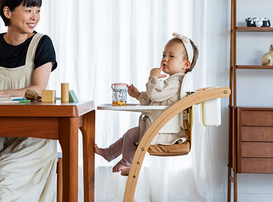 姿勢が安定することで、自分で手づかみ食べを始めたり、スプーンを上手に使えるようになります。