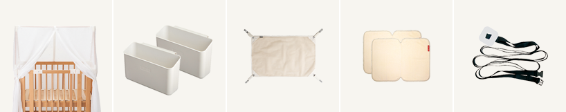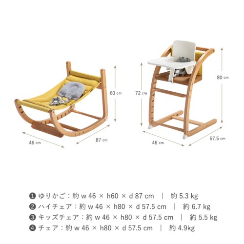 ゆりかごチェアからハイチェアまでに必要なアクセサリー類は全て付属しています。ご自宅に届いたその日から永くご愛用いただけます。