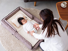 防水シートがあれば、コンパクトベッド上でのおむつ替えなどのケアも、汚れを気にせずに行えます。