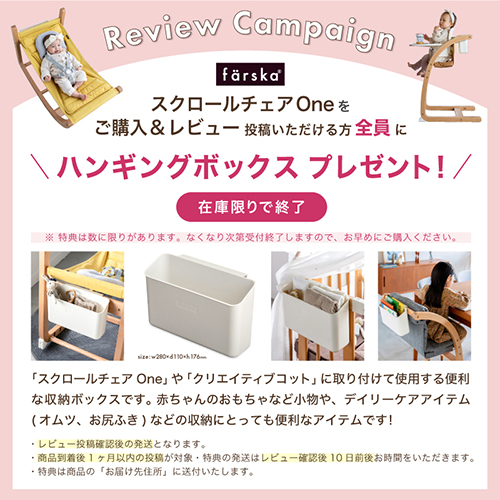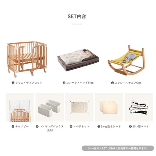 とっても便利なオプショングッズも揃っているので買い足し不要なコンプリートセット! 「クリエイティブコット」はベビーベッド、ベビーサークル、お絵かきテーブル、キッズソファ、学習デスクに。 「スクロールチェアONE」はゆりかご、ハイチェア、キッズチェア、ダイニングチェアに。 「ゆりかごとベビーベッド」が想い出の詰まった「椅子とデスク」へ形を変えて成長するので、出産準備の時期からのご購入がオススメです。
