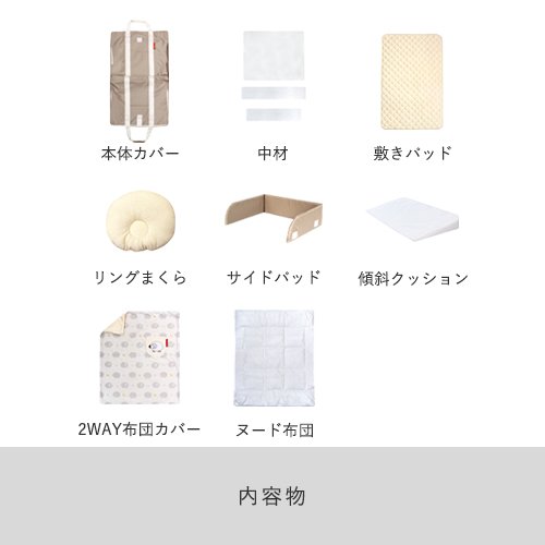| セット内容 | 本体カバー×1枚/固綿A×4個・固綿B×2個・固綿C×2個/2way布団カバー×1枚/ヌード布団×1個/サイドパッド×1個/敷きパッド×1枚/リング枕×1個/傾斜クッション×1個 |