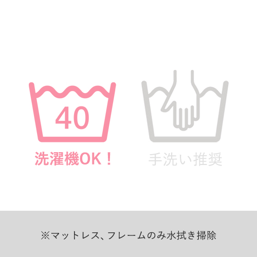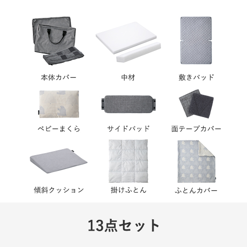 | 素材 | 本体カバー/マットレスカバー/フレームカバー/中材/掛け布団:ポリエステル100%、サイドパッド:ポリエステル100%/ウレタンフォーム、敷きパッド:綿80%/ポリエステル20%/ポリエステル100%、布団カバー/枕カバー:綿100%、傾斜クッション:綿80%/ポリエステル20%/ウレタンフォーム |