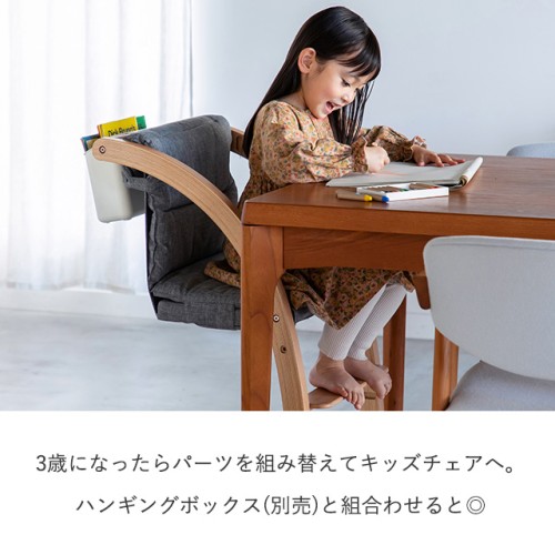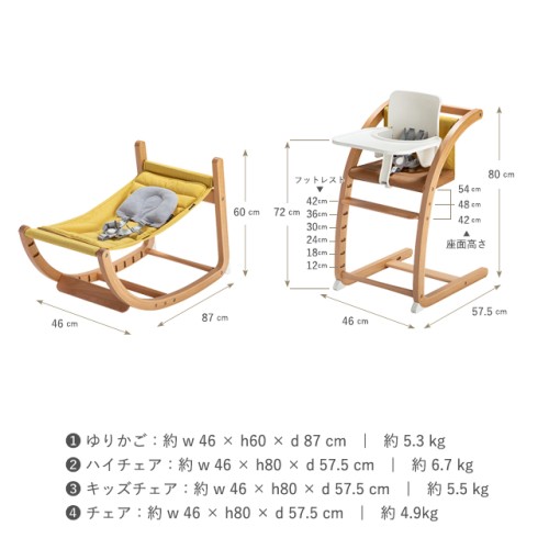 | 耐荷重/座面高さ | ゆりかご:約9kg、ハイチェア:約15kg、キッズチェア/チェア:約90kg |