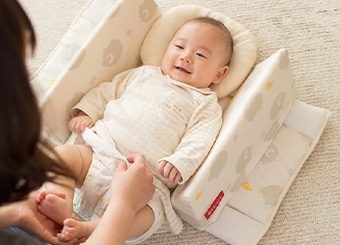動き回る元気な赤ちゃんのおむつ替えはママも一苦労。リビングでのおむつ替え時も、ベッドインベッドエイドがあれば、いつもより早く済ませてあげることができます。