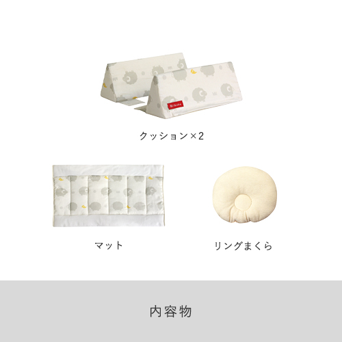 | 素材 | マット:生地(綿)、側生地(ポリエステル)、詰物(ポリエステル) / クッション:生地(綿)、詰物(ウレタンフォーム) / リングまくら:生地(綿80%・ポリエステル20%)、詰物(ポリエステル) |