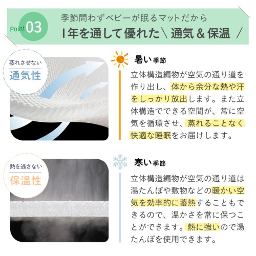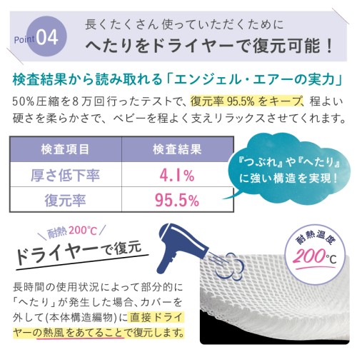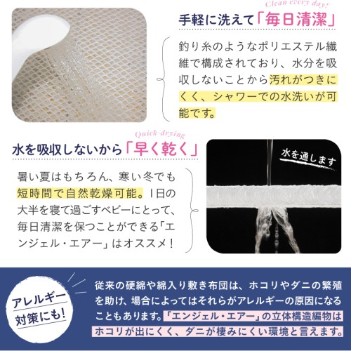 新生児から使える体圧分散ベビーマットレス「エンジェルエアー」は、SIDS対策と快適な睡眠環境を両立した革新的な赤ちゃん用マットレスです。 うつぶせ寝になっても呼吸を妨げない立体構造で、優れた通気性で窒息リスクを軽減します。 従来の固綿や綿入り布団と比べてホコリが出にくく、ダニが寄り付きにくくアレルギー対策にも効果的です。