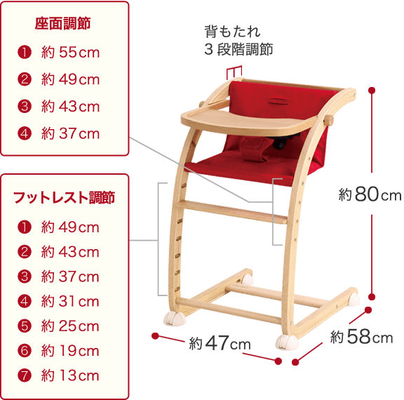 テーブルの固定位置をスライドで自由に調節できます。ダイニングテーブルとの距離や、お食事やお絵描きのしやすい適切な位置に調節してあげられます。