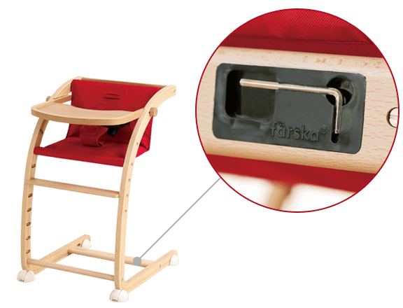 スクロールチェアは1種類のネジで組立てが行えます。 組立て/組み替え作業がシンプルになったため、組立てミスを防ぎ、シート位置の調節やロッキングチェア→チェアへの変更にも手間がかかりません。