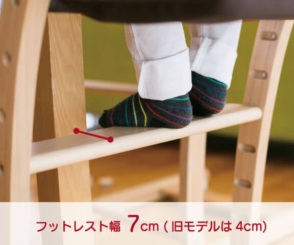 スクロールチェアプラスからフットレストが付きました。足をしっかり着いて座れるため、姿勢の崩れを防ぐとともに、長時間の使用でも快適に使用することができます。