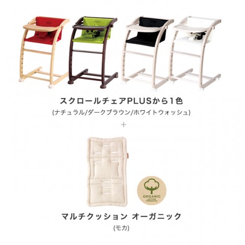 ファルスカの「一生ものの椅子」スクロールチェアのオリジナルセット。 初めはバウンサーとして、腰据わり後からはベビーチェアとしてご愛用いただけるスクロールチェアプラスとマルチクッションオーガニックのお得なセットです。