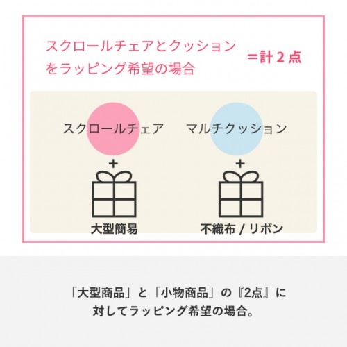 | ラッピング | スクロールチェアプラスは「大型簡易」ラッピング マルチクッションは「不織布ラッピング」、「熨斗」、「リボン」ラッピングをご購入ください |