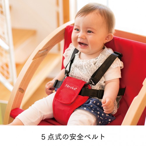 自動車のシートベルトと同じ素材を使用した5点式のセーフティベルトが、赤ちゃんがチェアから転落・抜け出しをしないように固定してくれます。耐久性にも優れています◎