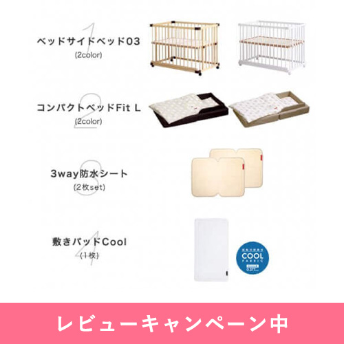 | セット内容 | ①ベッドサイドベッド03(添い寝安全ベルト付き) ②コンパクトベッドフィットL(布団カバー・ヌード布団・敷きパッド・リング枕・傾斜クッション等) ③防水シート2枚 ④敷きパッドCOOL Lサイズ |
