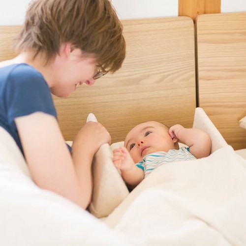 3way防水シート1枚付きの、持ち運びにも便利な添い寝セットです。成長に合わせて添い寝クッションの幅を調節できるため、12ヶ月頃まで長くご使用いただけます。 オーガニックコットンを使用したプレミアムモデルなので、生まれたての赤ちゃんの敏感な肌にも安心です。