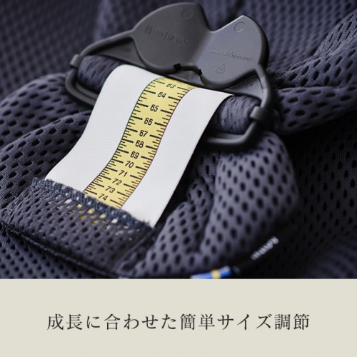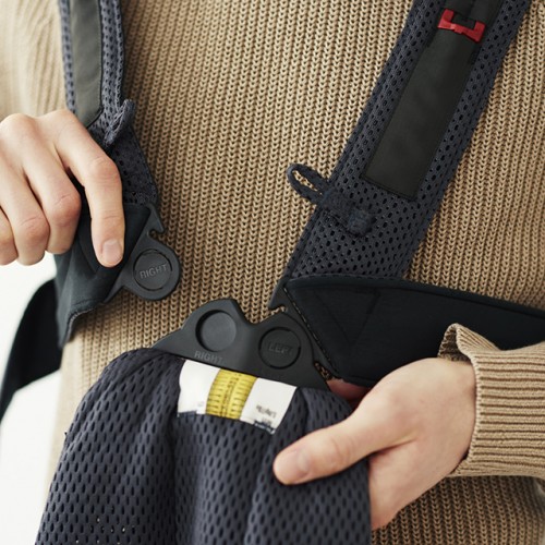 ベビービョルの抱っこ紐は、片方の手で赤ちゃんを支えながら、安全に着脱できる構造です。簡単設計なので着脱に場所を選びません。