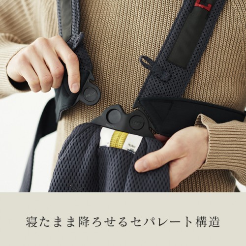 ベルトと本体が別々になっているミニは、背中に手を回すことなく全て身体の前面でバックル開閉やベルト調節を行えます。眠った赤ちゃんを最小限に刺激せずに降ろすことができるので、大切な眠りを妨げません。