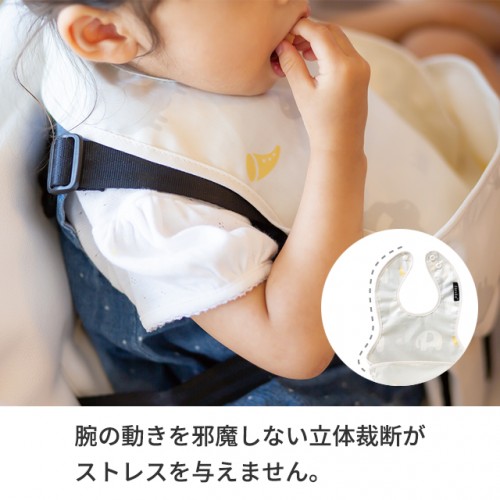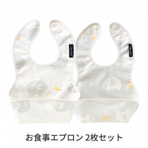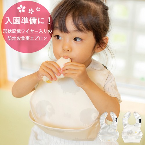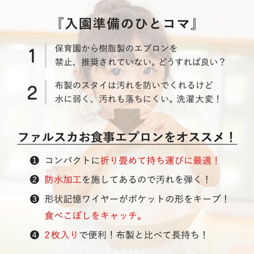 ファルスカからお食事エプロンが登場。シリコン製と布製の良いところを組み合わせた"ありそうでなかった"アイテムです。 防水加工された布製のエプロンをベースに、ポケットに入った形状記憶ワイヤーが食べこぼしをしっかりキャッチします!従来のエプロンでママの悩みだった、お食事中にエプロンがテーブルなどに引っかかり、お子さまの集中力を奪ってしまう…なんてこともこれで解決!毎日洗えるように嬉しい2枚セット♪