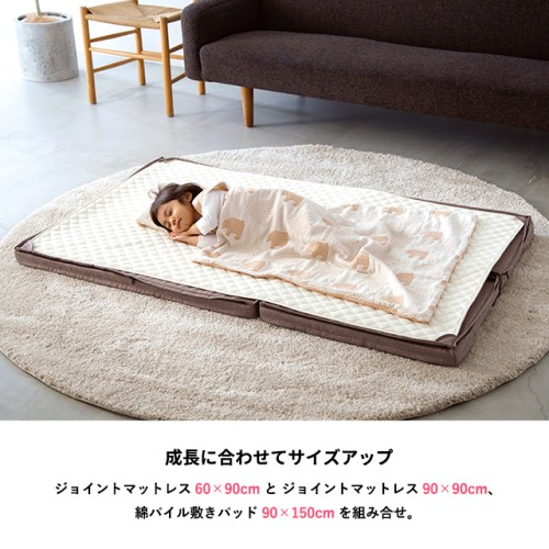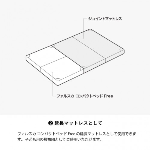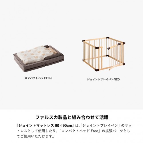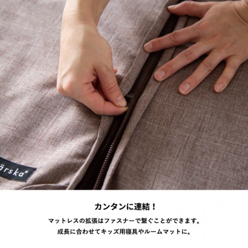 コンパクトベッドFreeと連結ができ、キッズ用のお布団やプレイマット、リビングマットとして使える多機能マットレスです。 クリエイティブコットやミニジョイントベッドNEOをキッズソファとして使用する際に、背もたれ部のクッションとして使えます。ジョイントプレイペンNEOにぴったりジャストサイズです。 マットの表面は撥水加工で汚れに強いハイグレードなポリエステル生地を使用しています。カバーは外して洗濯できるので衛生的です。 弾力性と通気性に優れた中材を使用しているので、おねんね用のマットレスやクッションにも適しています。中材は高反発素材だから、赤ちゃんが転んだり倒れたりしても安全です。 コンパクトベッドFreeのマットレスとジョイントマットレスはファスナーで簡単に繋ぐことができます。 大人が寝たり座ったりしても心地が良く、リビングのラグやリラックススペースとしてロングユースが可能です。