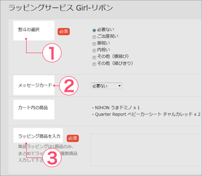 ![]() ラッピングしたい商品を、どのようにラッピングするか指定します。