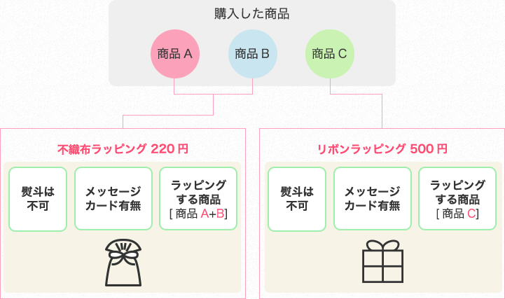 - ❶『不織布ラッピング』に1つに入らない場合=不織布ラッピング1点(220円)の追加購入