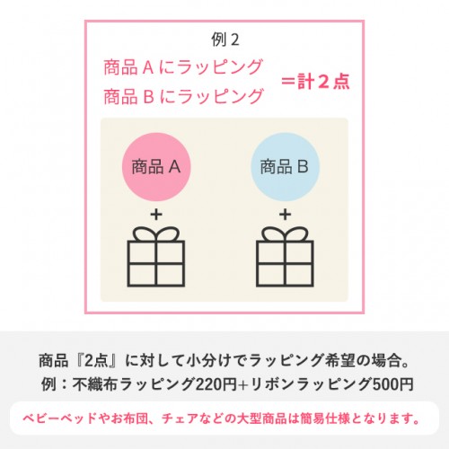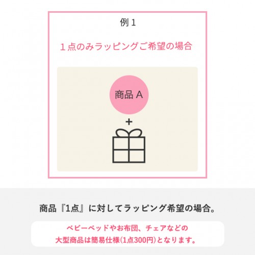 | 大型商品について | ベビーベッドやチェアなどの大型商品も一部ラッピングを承っております。 |