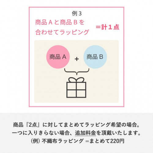 - ❷『不織布ラッピング』で通常サイズと大型サイズの商品を同時購入している場合=不織布ラッピング1点(220円)+大型簡易1点(300円)でラッピング対応致します。