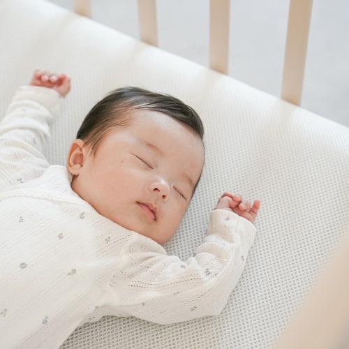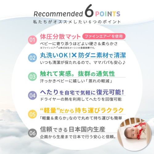 あわいカラーリングがお部屋のインテリアに馴染みやすい「ミニベビーベッド」とへたらない日本製「体圧分散マットレス」をセットにしました。寝室スペースにあまり余裕がなかったり、ゆくゆくは大人ベッドで一緒に寝たいという方にオススメです。特にマットレスは汚れやすくお洗濯も大変です。こちらのマットレスはシャワー洗いOKで乾きやすい素材なので清潔を保つことができます。