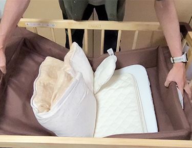 足の力が強く、生後2ヶ月頃にはコンパクトベッドの中でクルクル動いていたのでベッドインベッドエイドを使い横向きにならないよう対策しました。