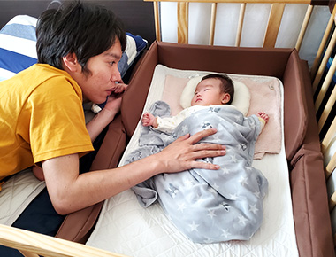 大人用ベッドに一箇所柵を外して横付けしました。寝転がった状態で様子を確認したり手を伸ばしてお世話ができるので毎日とても助かっています!寝ながら様子を見ることもでき、手が届く範囲に娘がいることで安心感もあります。