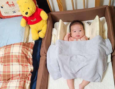 夜間は寝室のミニジョイントベットネオに乗せ、日中はリビングに運び、娘は1日中コンパクトベッドで過ごしています。生後1ヶ月ごろから寝てる間に足を動かしてベッド内で横に回転したり、左右に寄ったりしているのですが…枠の高さがあることでベッド内からはみ出ることはないので良かったです!