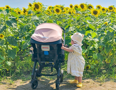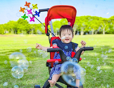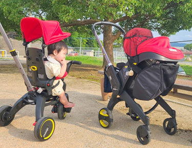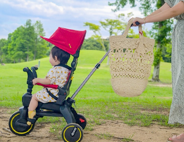 初めて乗った時もニコニコで楽しんでいる様子でした!ハンドル操作もスムーズで、日差しを遮ることができるのも魅力的だと感じました。組み立ても簡単で、トランクに入れっぱなしでもかさばらず、どこにでも持ち運べるのはとても便利です!セカンドベビーカーとしても使えます!