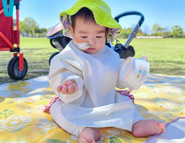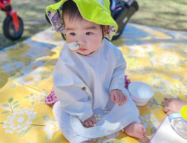 つかみ食べで袖までボロボロ、ぐちゃぐちゃに汚れますが袖までエプロンがあるので洋服汚れは気にせず離乳食に集中できます!お外で遊ぶ時もそのままエプロンをつけて汚れ対策として活躍しています。袋に入れてコンパクトに持ち運べるのも魅力です。