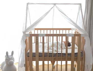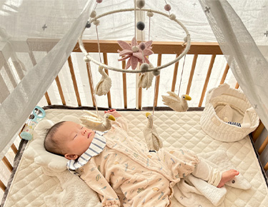 キャスターもスムーズなので、ご飯の支度の時はキッチンに移動させたりもしています。キャノピーは光を和らげてくれたり、埃などからも守ってくれるので、安心感があります。