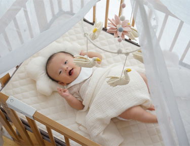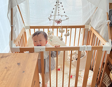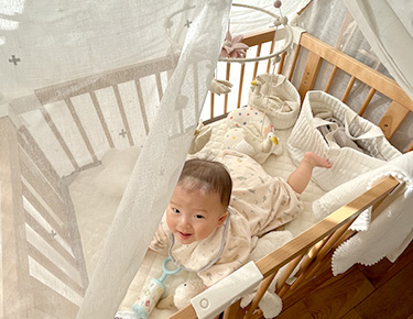 また、上の子が遊ぶおもちゃ(LEGOなどの細かいもの)があり、床で一緒に過ごすことが危なく感じることも多く…そんなときクリエイティブコットへ寝かせてあげればベットの中でガラガラを持たせたり、ぬいぐるみを置いたりと安心して遊ばせることができています。