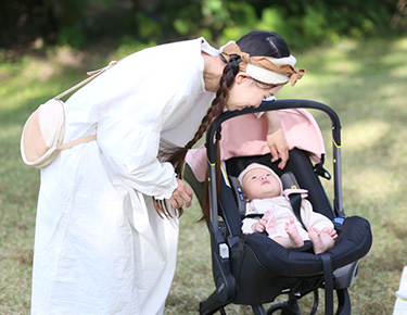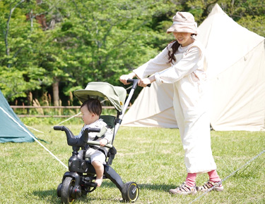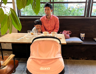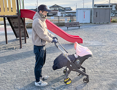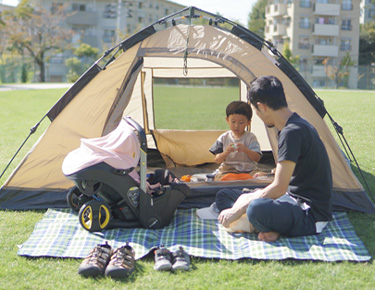 レジャーシートやテントの中など地面に近いところ(固いところ)へ下ろすのに少し抵抗がありますが、doonaはそのまま折りたたみ一緒に過ごすことができるので、本当に助かっています。