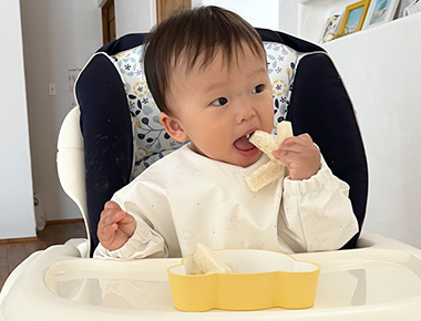 掴み食べの時によく使っています。ポケットが大きく開くので、食べこぼしをキャッチしてくれます。