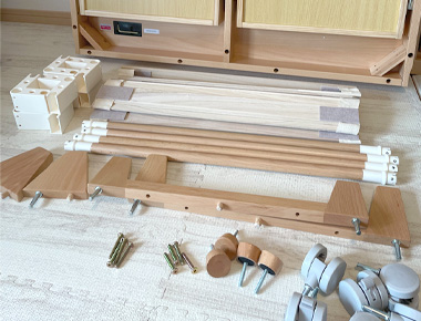 各パーツはドライバーではなく、パチっと組み合わせるだけなので、組立は楽だった気がします。組み立て後の状態はかなりコンパクトなので、お部屋もスッキリ。ただ、引き出し付きのパーツだけはとても重かったです…