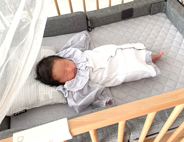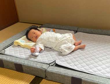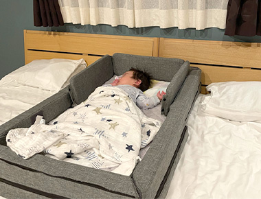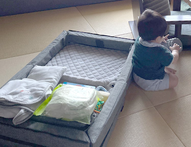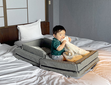 実家やホテルで泊まる時もいつも使っているコンパクトベッドを持っていくことで、安心して寝てくれました!ホテルのベッドはフカフカ過ぎてそこでそのまま寝かせるのは怖かったので、コンパクトベッドがあって本当に良かったです!