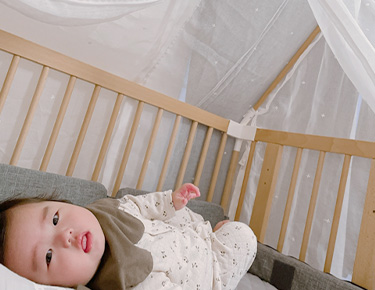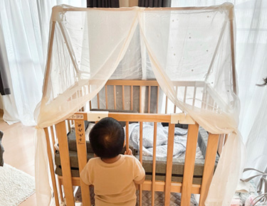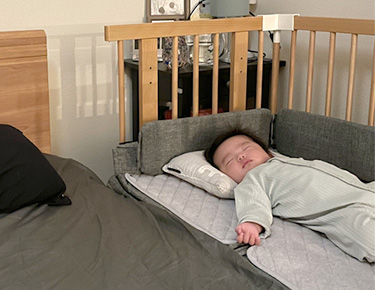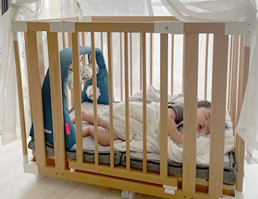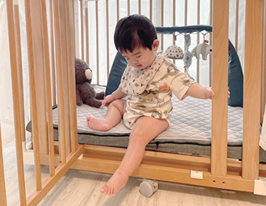 サークルに入れられると嫌がる子どもが多いと聞きますが、新生児の頃から寝ているコットとベッドで構成されているサークルだからか、サークルに入っている時も落ち着いてくれています。