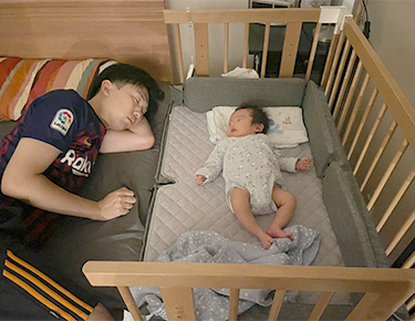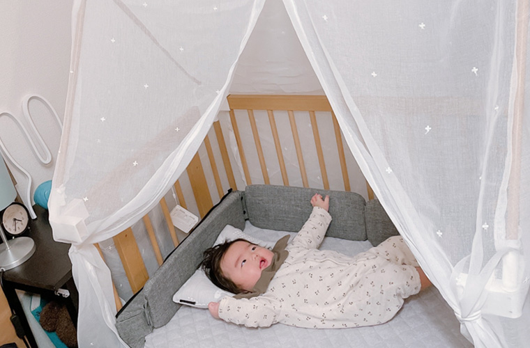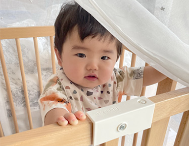 柵の付け外しが簡単なので、日中はリビング、夜は添い寝ベッドへ切り替えを楽に行えます。リビングから寝室への移動も静音キャスターのおかげでとってもスムーズです。