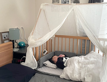 週に1度実家に帰る際、簡単に折り畳んで持ち運べるのが楽です。コンパクトベッドはマットレス、フレームがしっかりとしている点、いつもの匂いがする点から、実家でも安心して使用できました。